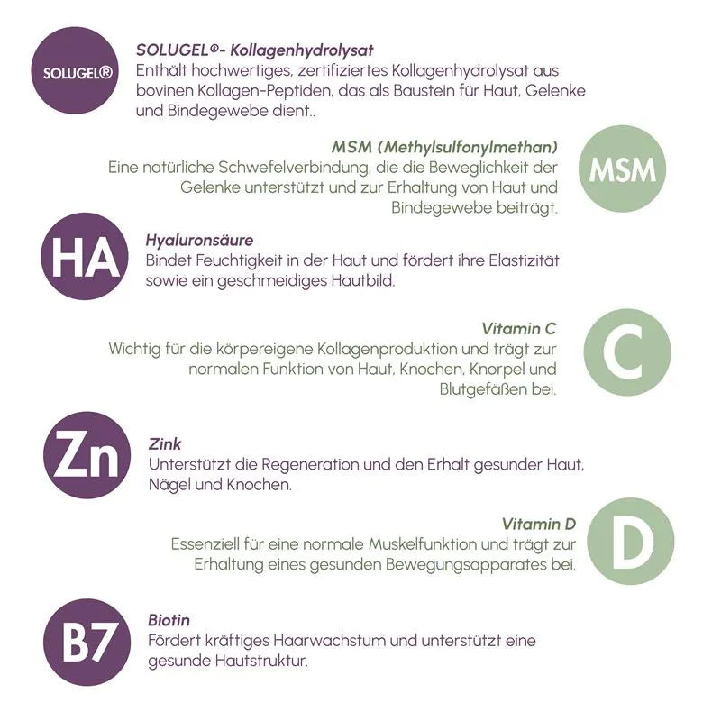 Kollagenhydrolysat (Rind), Methylsulfonylmethan (MSM), Hyaluronsäure, L-Ascorbinsäure (Vitamin C), Zinkoxid, Cholecalciferol (Vitamin D3), D-BiotinVerzehrempfehlung: