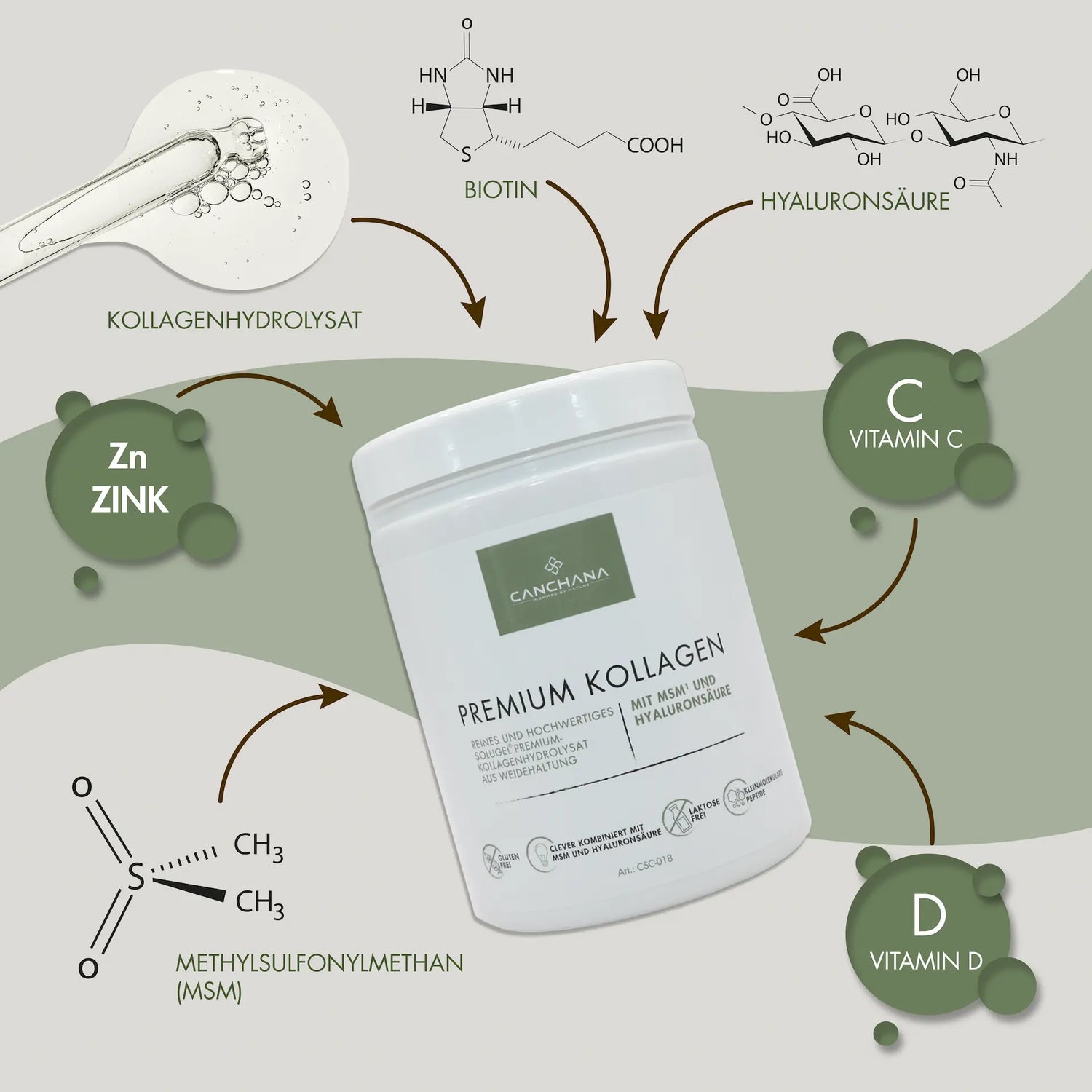 - Kombination – unterstützt zentrale Prozesse im Körper und ergänzt die Wirkung weiterer Nährstoffe in Canchana Premium Kollagen
