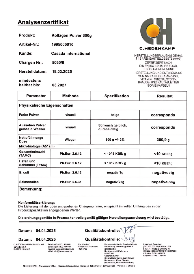 Jede Charge unseres Kollagen-Pulvers wird in unabhängigen Labors geprüft, um Reinheit, Sicherheit und Produkttreue zu gewährleisten. Das nebenstehende Analysenzertifikat bestätigt: